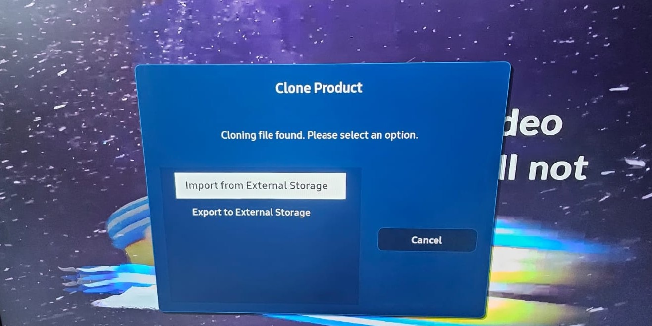 A different screen will request to select an action (Import or Export) - Select Import from External Storage and the cloning process will start.