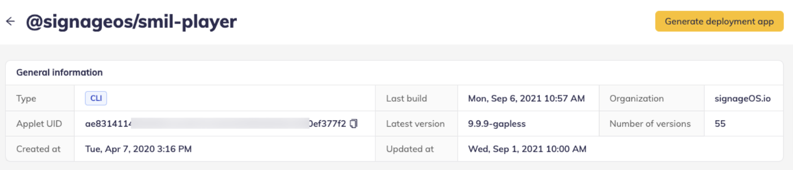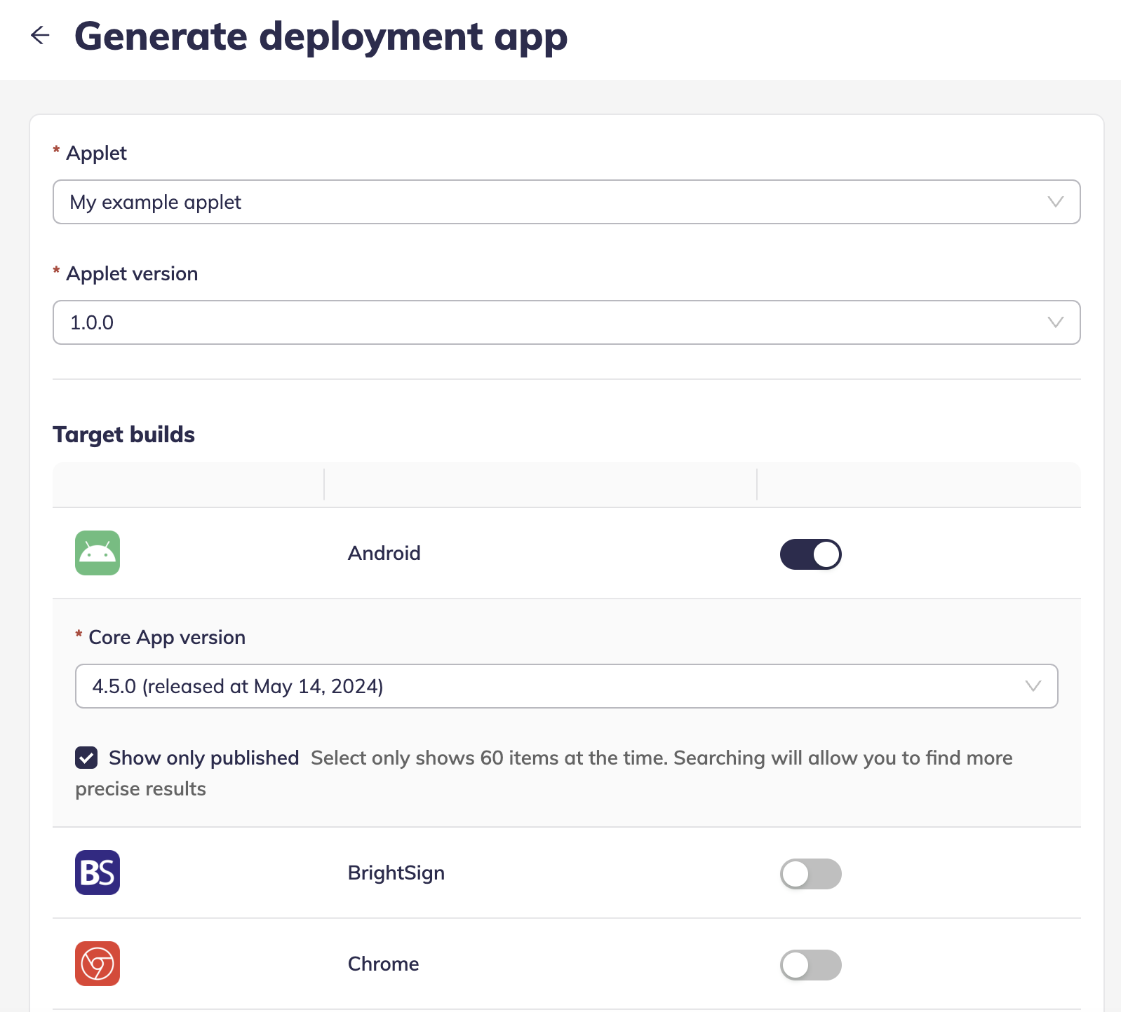 On the top right corner of the page you can find Generate deployment app button. By clicking this button you will be offered platforms supported by signageOS, by selecting a platform an application containing your Applet will be created. By provisioning a display with this Deployment app your display will be automatically assigned to the Organization under which this Applet was created.