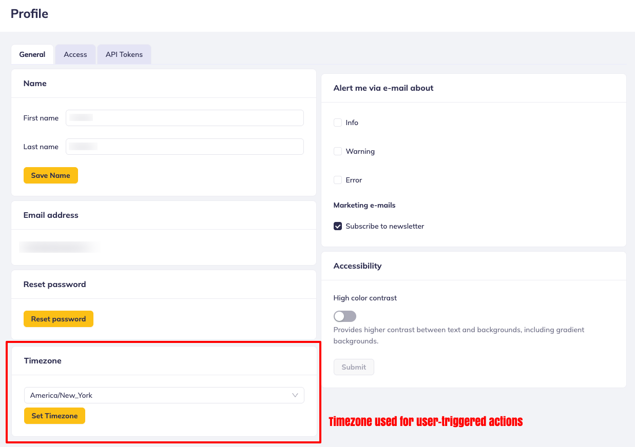 - All user-invoked actions are shown in UTC timezone OR in the timezone selected on the user profile.