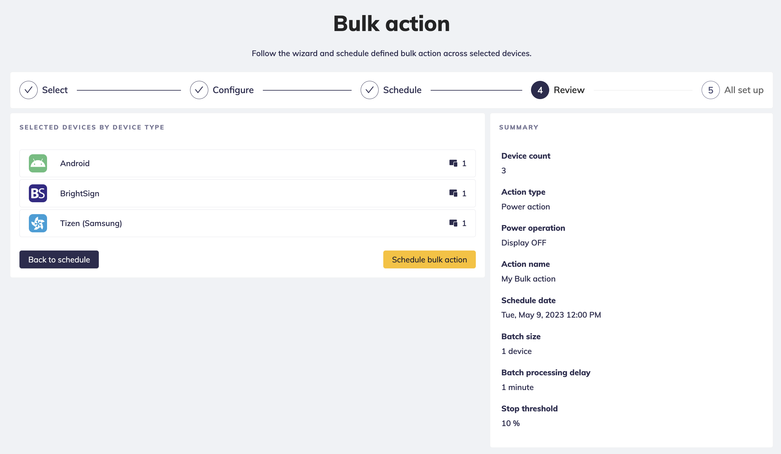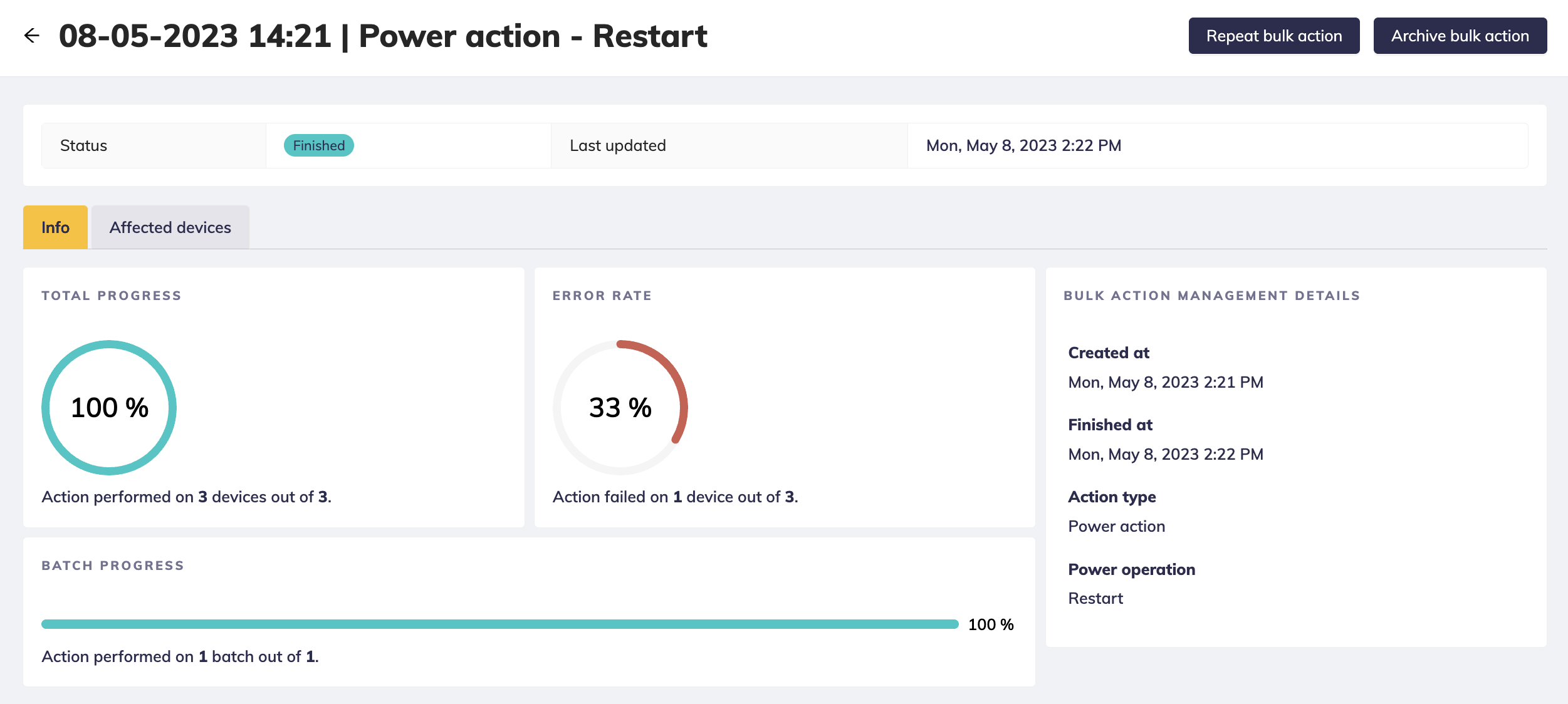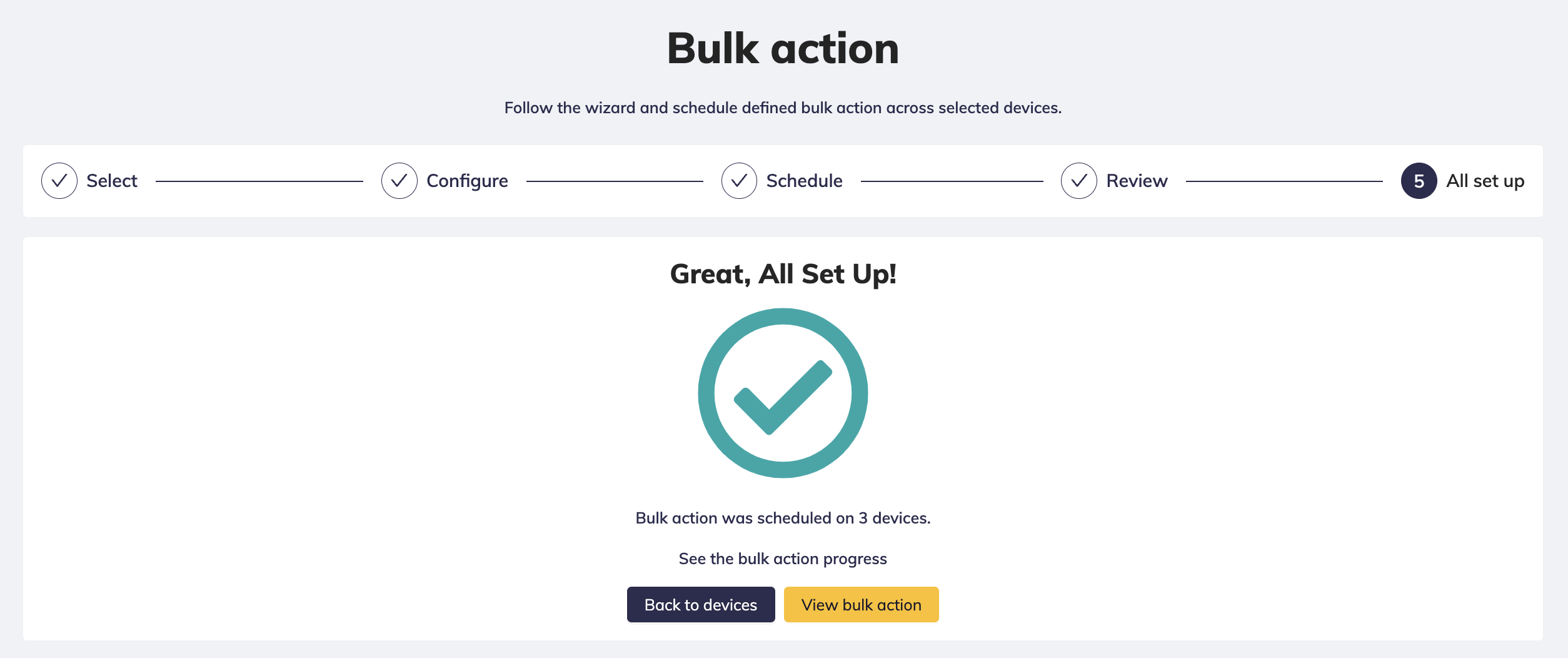 Before executing the Bulk action you will be prompted with an overview of created operation, selected devices, operation name, execution date and other information: