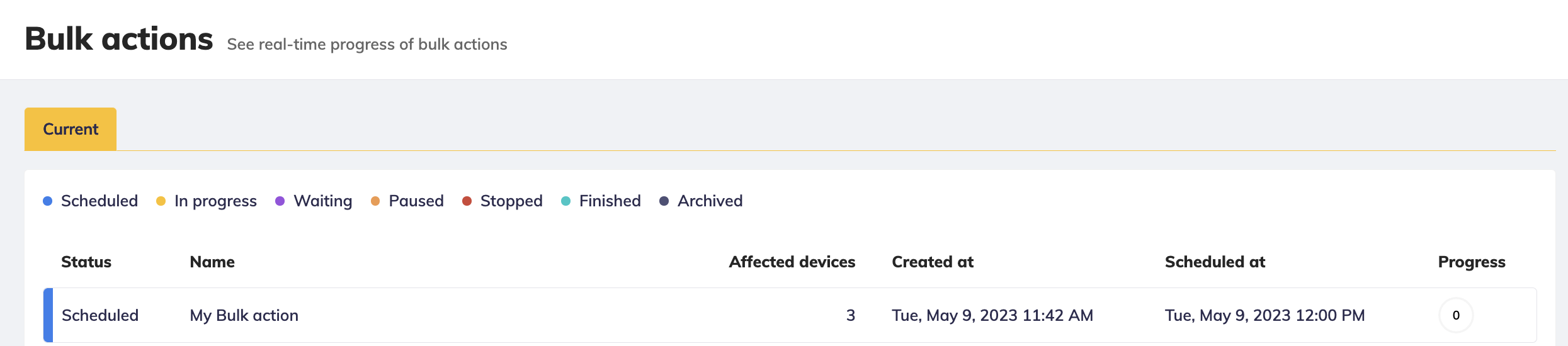 Under Bulk actions list you can see all your Bulk actions with indication on their current states: