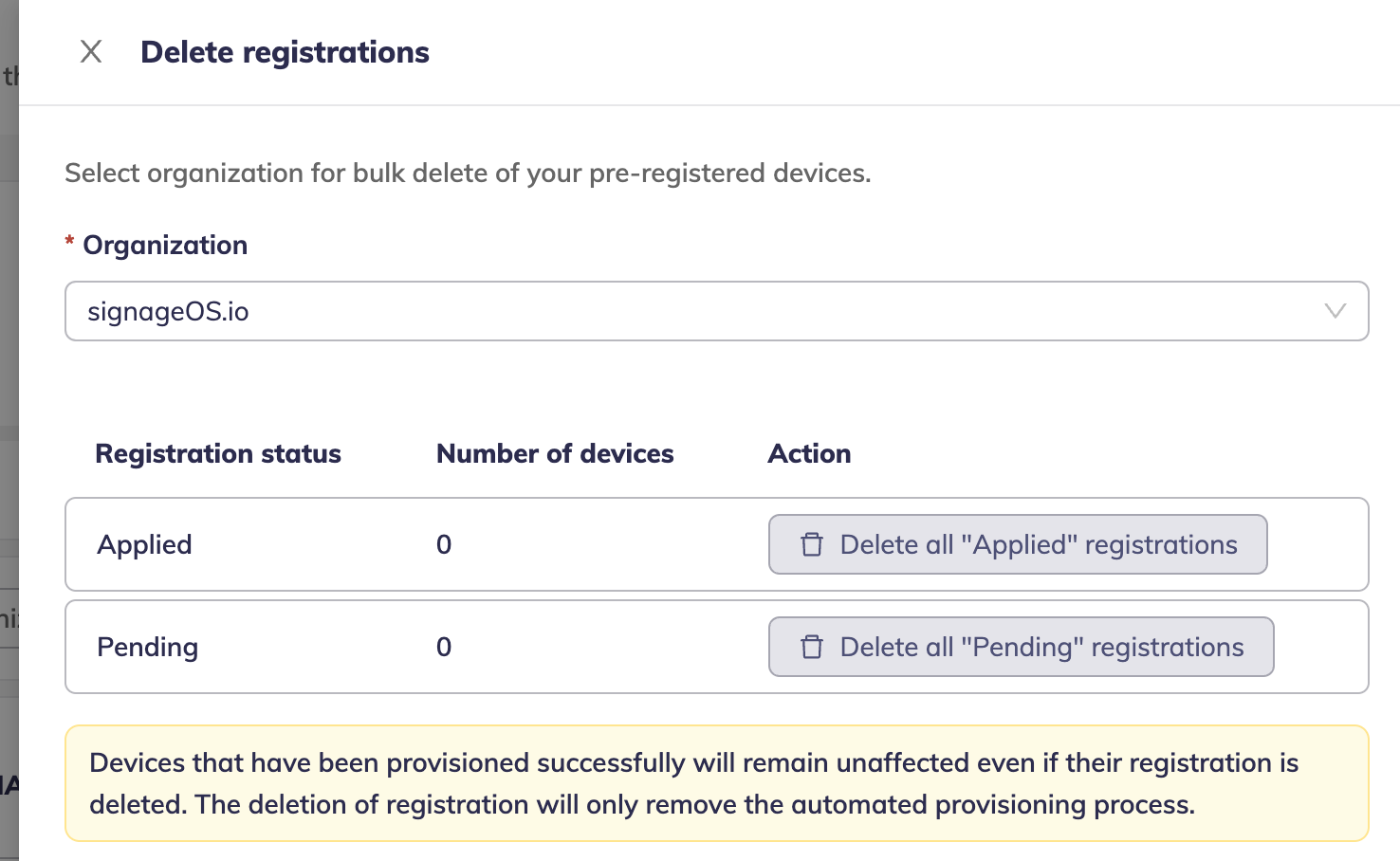 Registrations can be deleted no matter the state - Applied or Pending. Devices that have been provisioned successfully will remain unaffected even if their registration is deleted. The deletion of registration will only remove the automated provisioning process.
